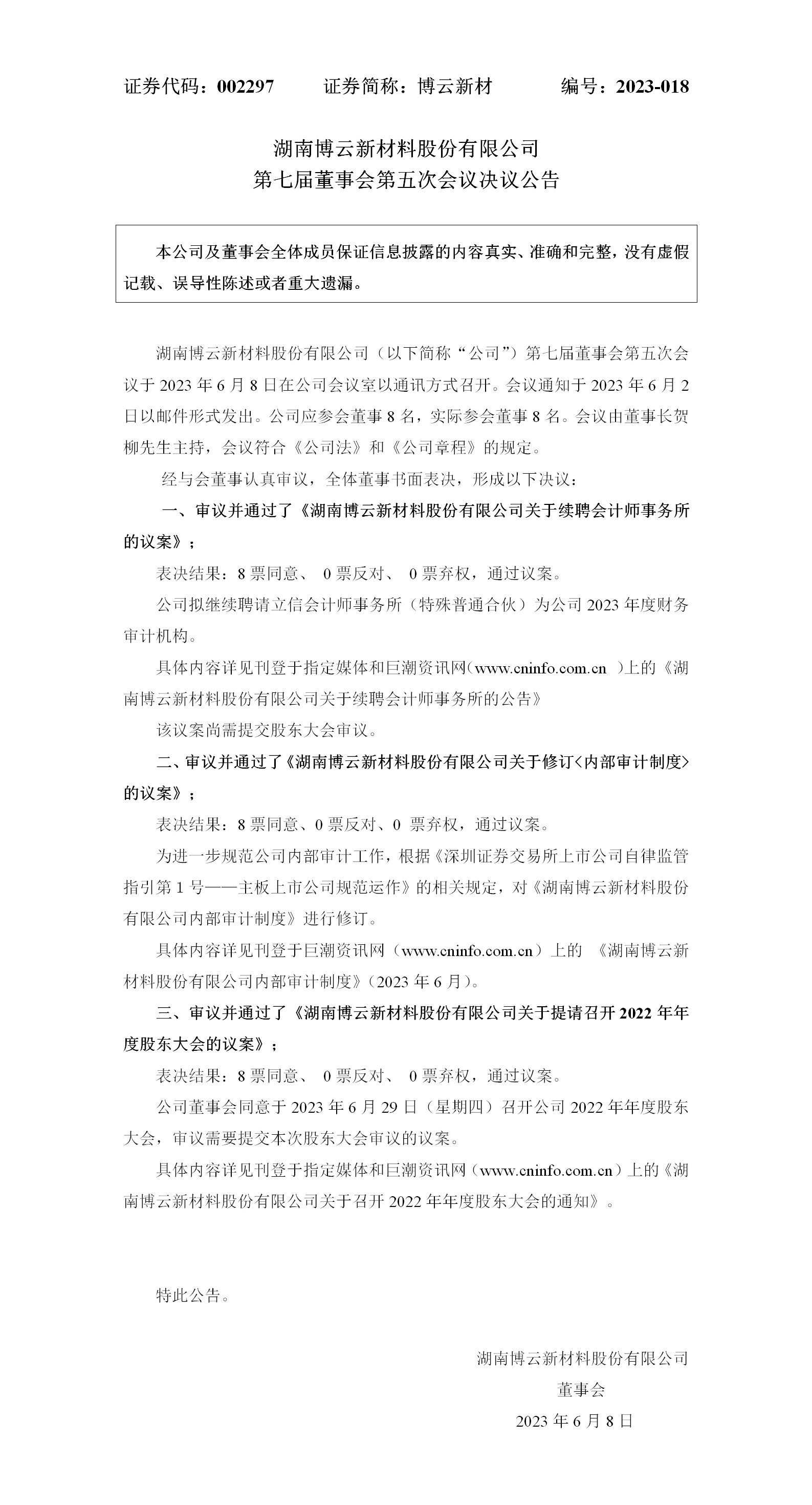 【2023-018】第七届董事会第五次聚会决议通告