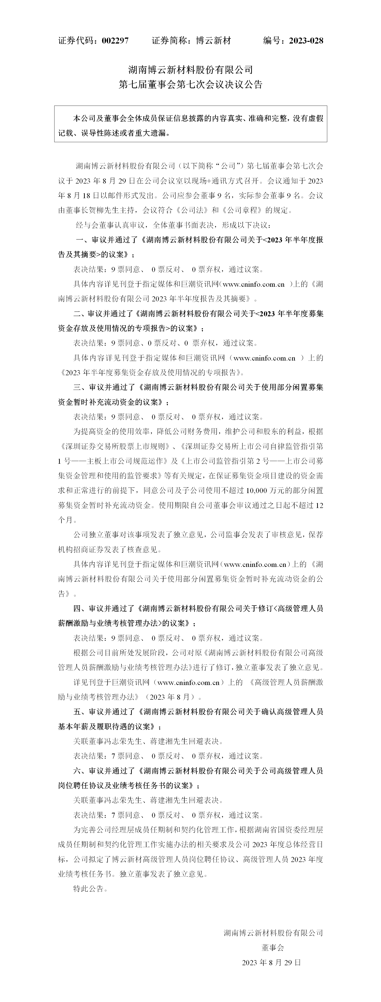 【2023-028】第七届董事会第七次聚会决议通告