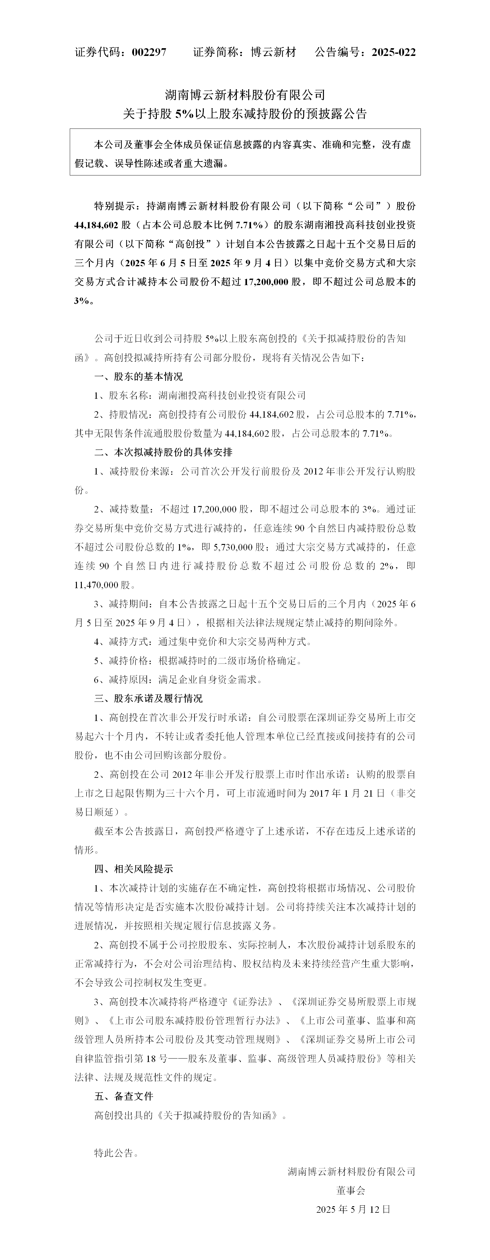 【2025-022】关于持股5%以上股东减持股份的预披露通告