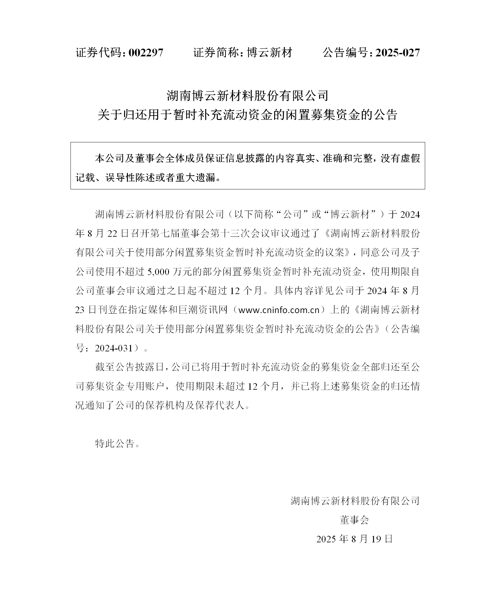 【2025-027】关于送还用于暂时增补流动资金的闲置召募资金的通告
