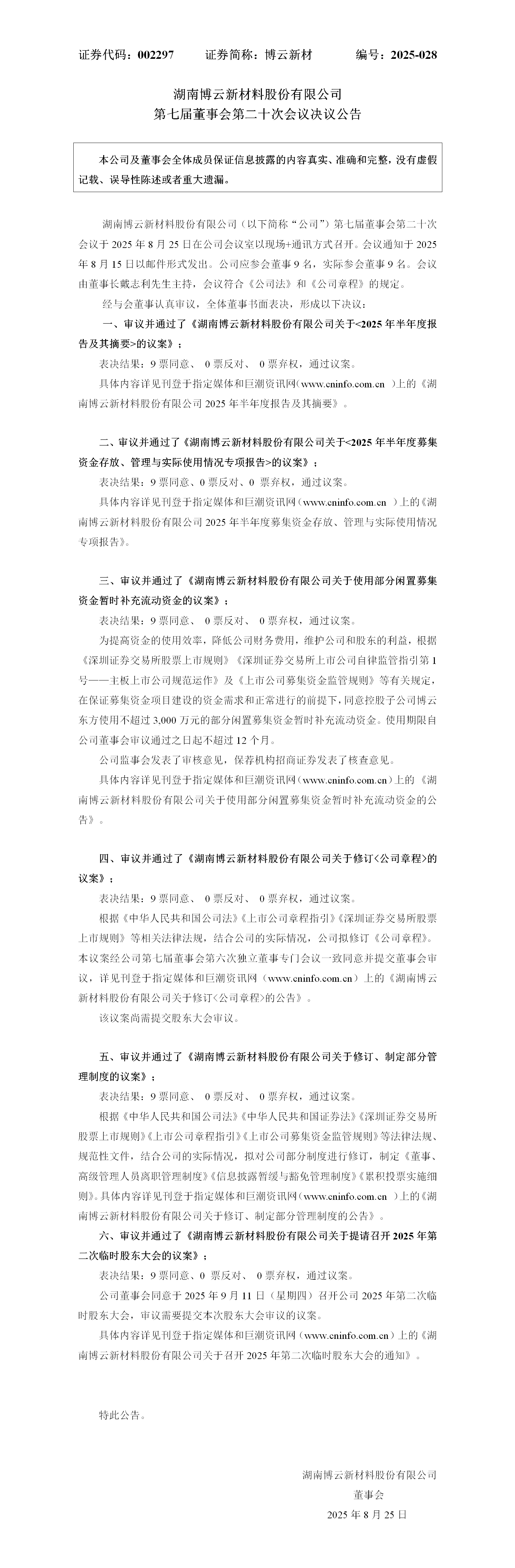 【2025-028】第七届董事会第二十次聚会决议通告