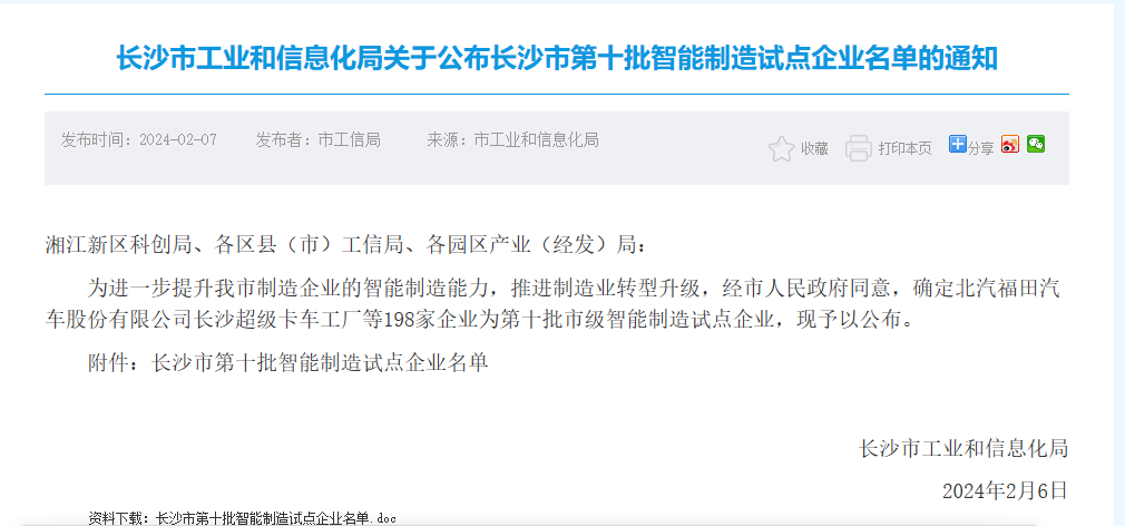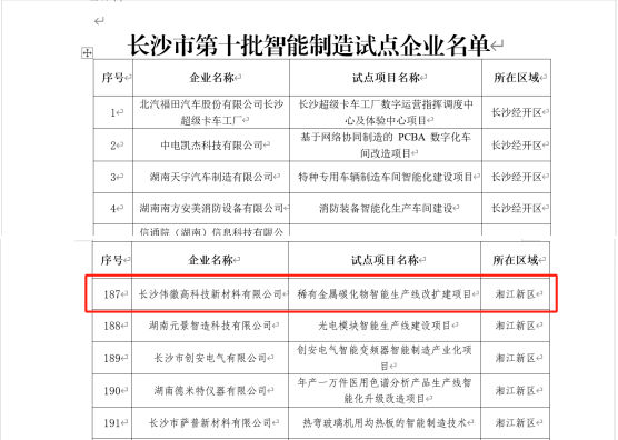 克日,,,,,,,长沙市工业和信息化局下发《关于宣布长沙市第十批智能制造试点企业名单的通知》,,,,,,,确定长沙伟徽高科技新质料有限公司为第十批市级智能制造试点企业。。。。。。。