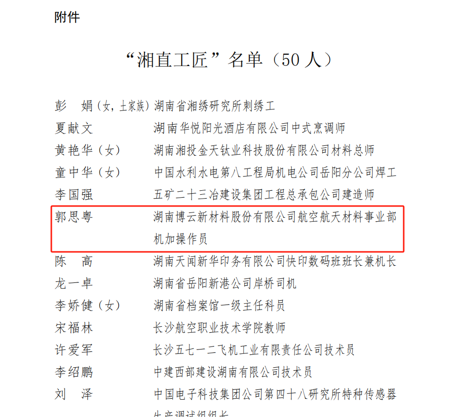 为弘扬执着专注、字斟句酌、一丝不苟、追求卓越的工匠精神,,,,,,,,湖南省直属机关工会委员会宣布《开展“湘直工匠”推选运动的通知》,,,,,,,,经民主推荐、专家和劳模投票、现场核查、社会公示等环节,,,,,,,,2024年2月9日湖南省直属机关工会委员会宣布《湖南省直属机关委员会关于认定“湘直工匠”的决议》好博(中国)体育航材事业部机加操作员郭思粤荣获“湘直工匠”称呼。。。。。。。。